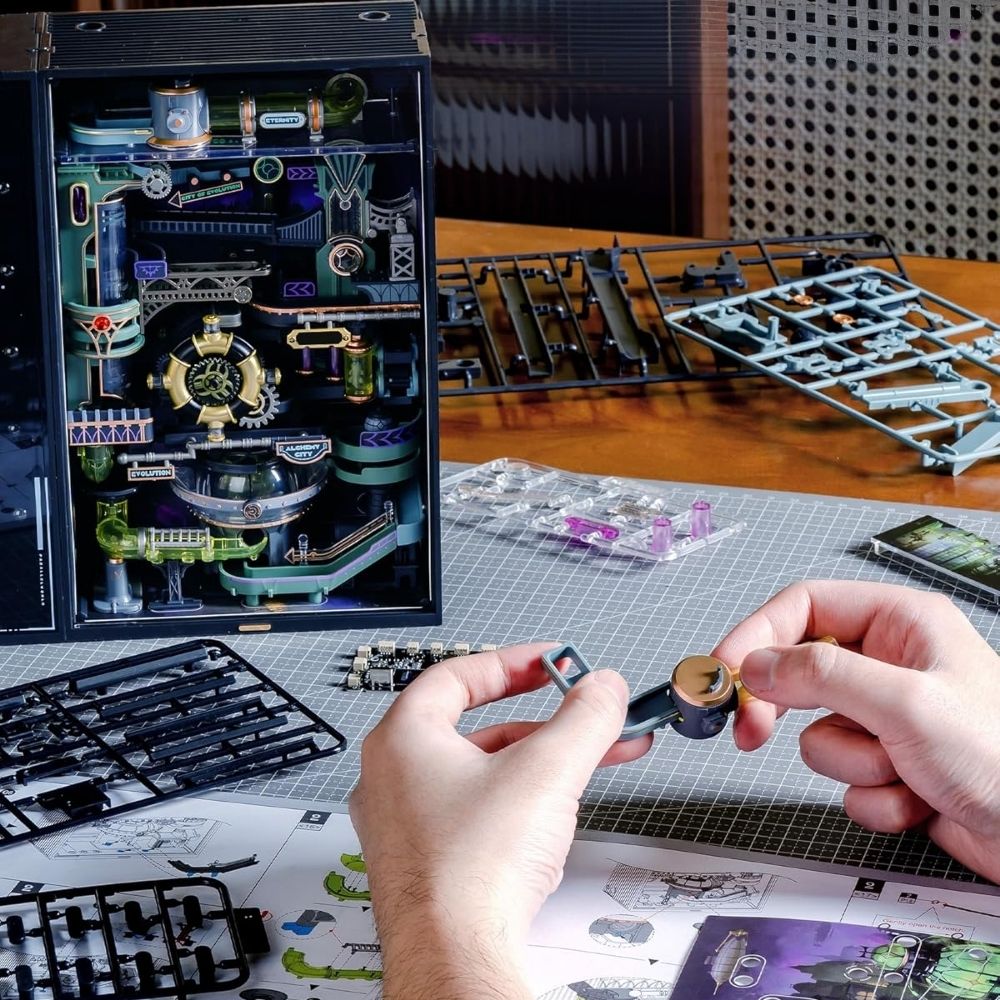 Ontdek een stad waar wetenschap en verbeelding tot leven komen met dit betoverende knikkerbaanmodel. Terwijl je elk onderdeel assembleert, ontvouwt zich een futuristische skyline, compleet met transparante banen, kronkelende bruggen en een continu tandwiellift die knikkers door het hart van de stad stuurt. LED-lampen en levendige kleuren versterken elke run en creëren een kinetisch schouwspel van beweging. Het praktische bouwproces combineert focus en creativiteit en biedt een lonende ervaring van het eerste stuk tot het laatste circuit. Eenmaal voltooid wordt het een opvallend middelpunt dat nieuwsgierigheid opwekt en uitnodigt tot spel.