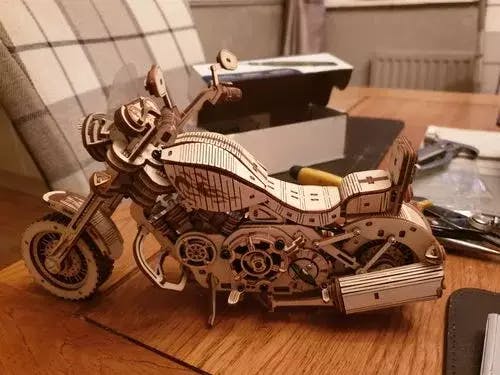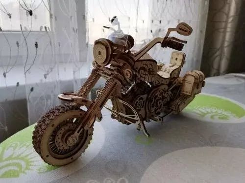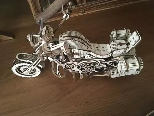 Draai de veer van deze motorfiets om hem tot 3 meter te laten rijden en observeer de beweging van de motorzuigers! Deze houten 3D-puzzel is een modelbouwpakket voor volwassenen, dat een spannende en vermakelijke ervaring biedt, terwijl je leert over de concepten van zwaartekracht, tandwielen en techniek.