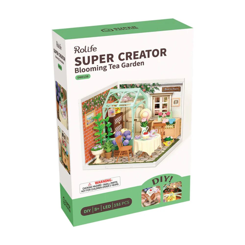 Dompel jezelf onder in de serene sfeer van een bloeiende theetuin met deze miniatuurhuis kit. Dit model stelt je in staat om een ruimte na te bootsen waar je kunt genieten van een kopje thee terwijl je de schoonheid van bloemen bewondert. Het interieur is ingericht met elementen zoals een theetafel, stoelen, bloemstukken, groene planten en LED-verlichting, wat een ontspannende sfeer creëert.