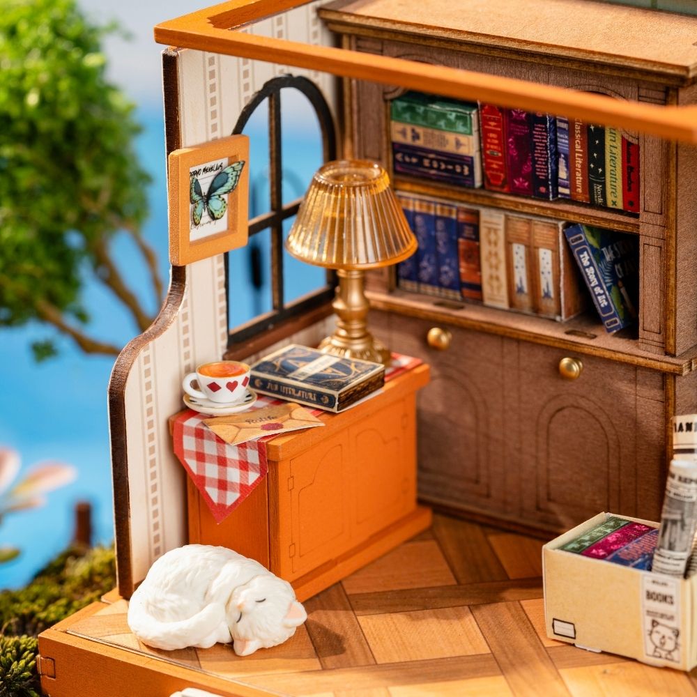 Dompel jezelf onder in de gezellige sfeer van een uitnodigende boekwinkel met deze miniatuurhuisjeskit. Dit model stelt je in staat om een ruimte na te bootsen waar boeken netjes zijn gerangschikt op houten planken, met decoratieve elementen zoals een leeslamp, tijdschriften en manden, waardoor een omgeving ontstaat die bevorderlijk is voor lezen en ontspanning.
