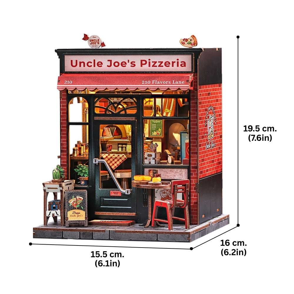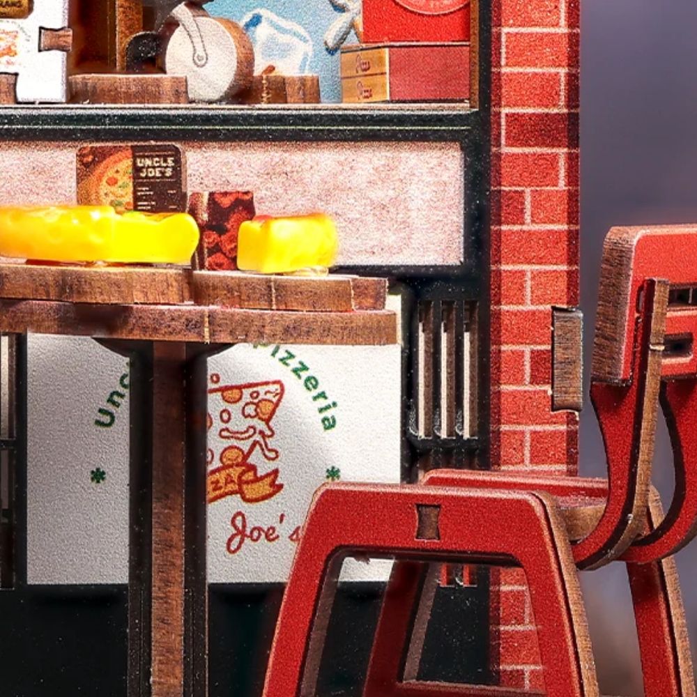 Nonkel Joes Pizzeria ligt op een rustig hoekje van het stadje en nodigt gasten uit met zijn warme sfeer en het onweerstaanbare comfort van zelfgemaakt eten. Het kleine winkeltje voelt als een vertrouwde ontmoetingsplek, waar de geur van versgebakken deeg de straat in waait en elk detail eenvoudige, oprechte charme uitstraalt. Met dit miniatuur huisje kun je die serene sfeer tot leven brengen: kleine boekjes, versleten houten trapjes en zacht gloeiende ramen, allemaal met zorg en geduld vervaardigd. Dit diorama is een vredig toevluchtsoord dat je met je eigen handen opbouwt, stuk voor stuk, met aandacht voor elk detail.