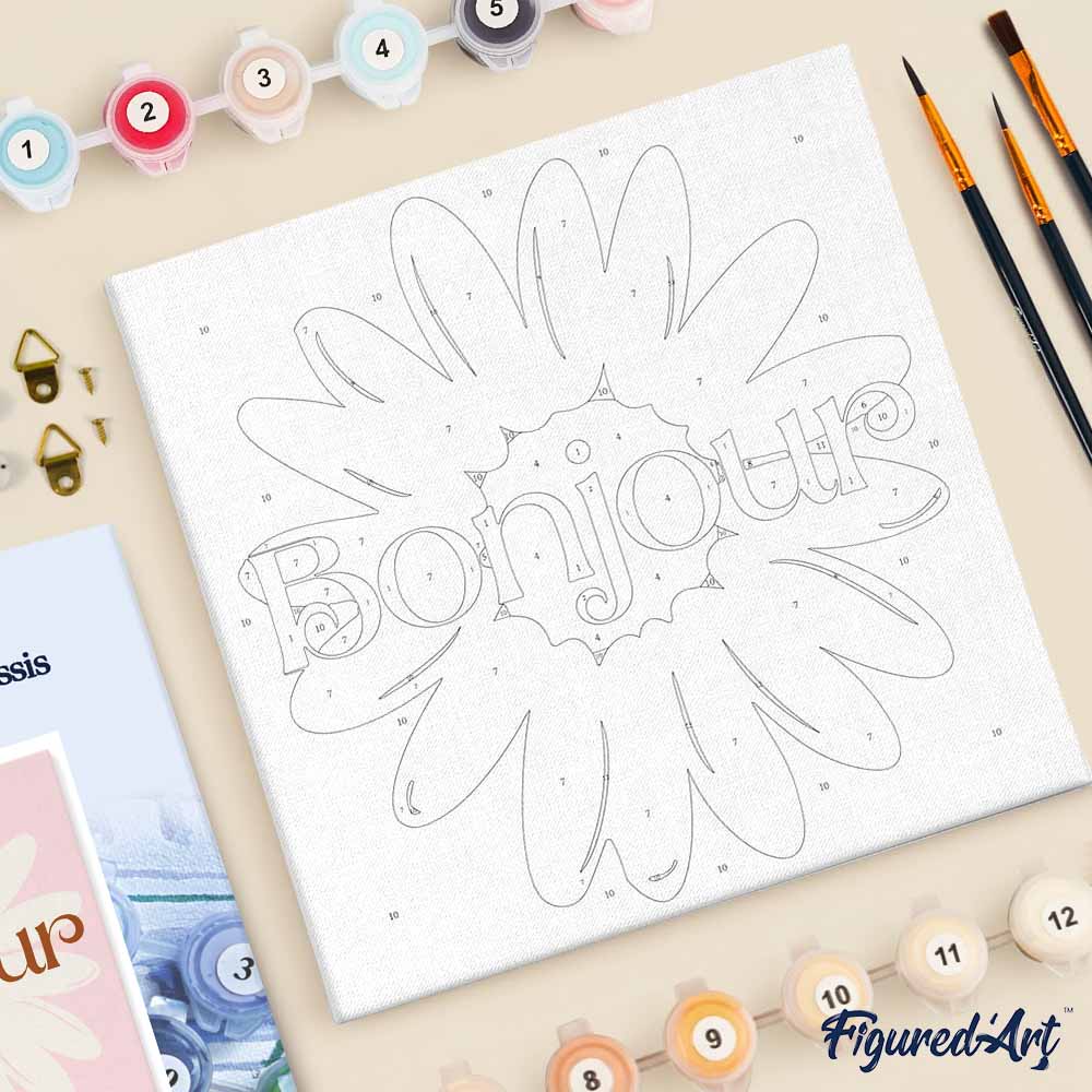2) Je ontvangt een compleet pakket met genummerd canvas, genummerde potten verf, penselen en een foto van het verwachte resultaat om jou te gidsen. Laat de reis beginnen!