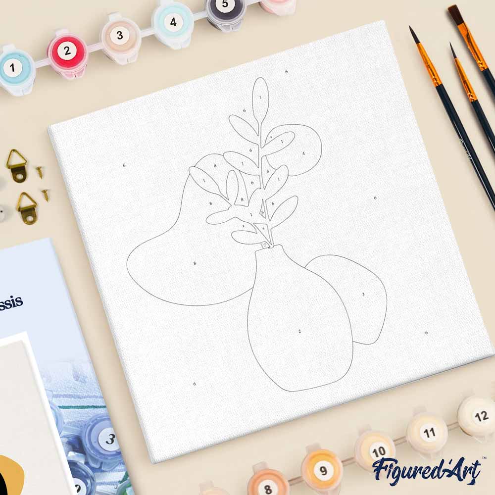 2) Je ontvangt een compleet pakket met genummerd canvas, genummerde potten verf, penselen en een foto van het verwachte resultaat om jou te gidsen. Laat de reis beginnen!
