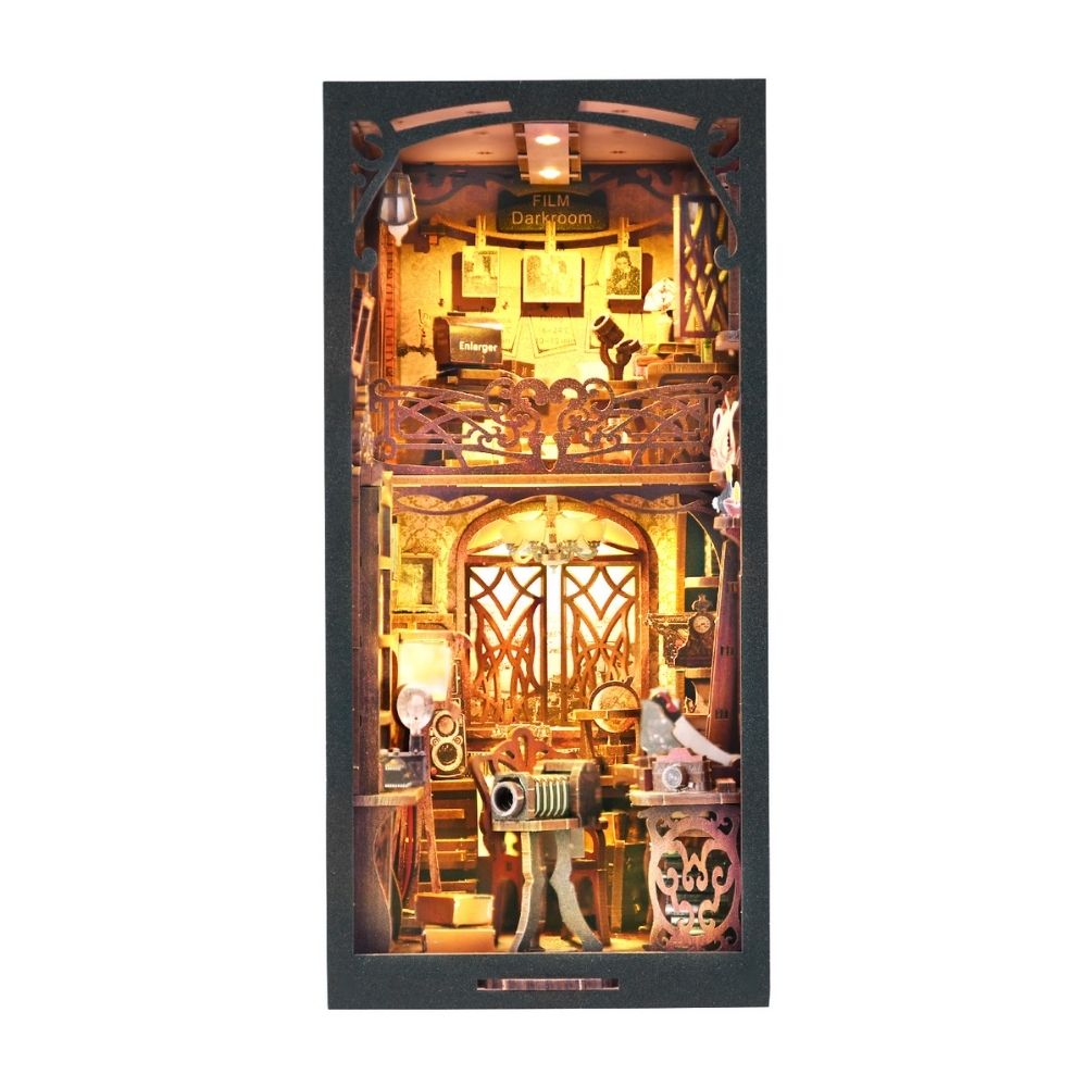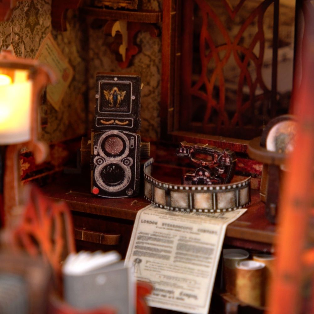Donkere Kamer is een betoverend Book Nook dat de kijker onderdompelt in een fascinerende vintage fotografische ontwikkelruimte. Binnenin wisselen planken vol antieke camera's en fotografiegerelateerde objecten zich af met details zoals een grote vergroottoestel en zachte verlichting die een unieke sfeer creëren. De scène wordt verrijkt met kleine accenten zoals opgehangen foto's en oude filmrollen, en neemt de kijker mee naar een wereld van vastgelegde herinneringen en fotografische kunst, perfect ingekaderd in dit kleine stukje geschiedenis.