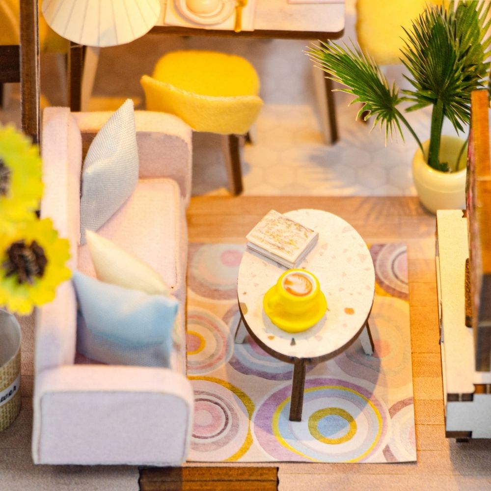 De Book Nook Roze Loft in hout is een miniatuurschuilplaats van modern leven—chic, comfortabel en gevuld met warmte. Ontworpen in zachte pastelkleuren en verlicht door zacht licht, transformeert het je plank in een elegante en charmante loft appartement. Binnen vertelt elk detail een verhaal van thuis: een zachte roze bank met kussens, een zonnige eettafel voor twee, een moderne keuken met de essentiële benodigdheden, en een lichte loft slaapkamer boven. Zonnebloemen en kamerplanten brengen frisse natuurlijke accenten, terwijl gouden hanglampen en delicate kroonluchters elegantie aan de ruimte toevoegen. De Roze Loft vangt de harmonie van het dagelijks leven—een mix van ontspanning, schoonheid en creativiteit. Het is een plek waar je je kunt voorstellen te lezen, dineren en in vrede te rusten, ver weg van de drukte van de wereld.