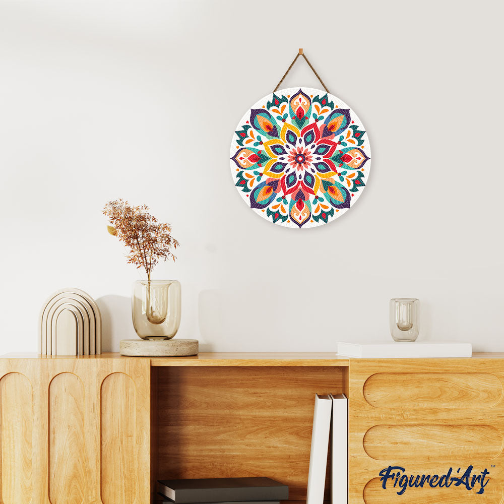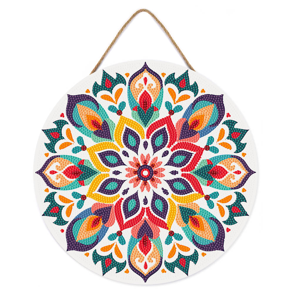 Een houten schijf van 30 cm in diameter met symbolen die overeenkomen met de diamanten, compleet met een touw om aan de muur te hangen.