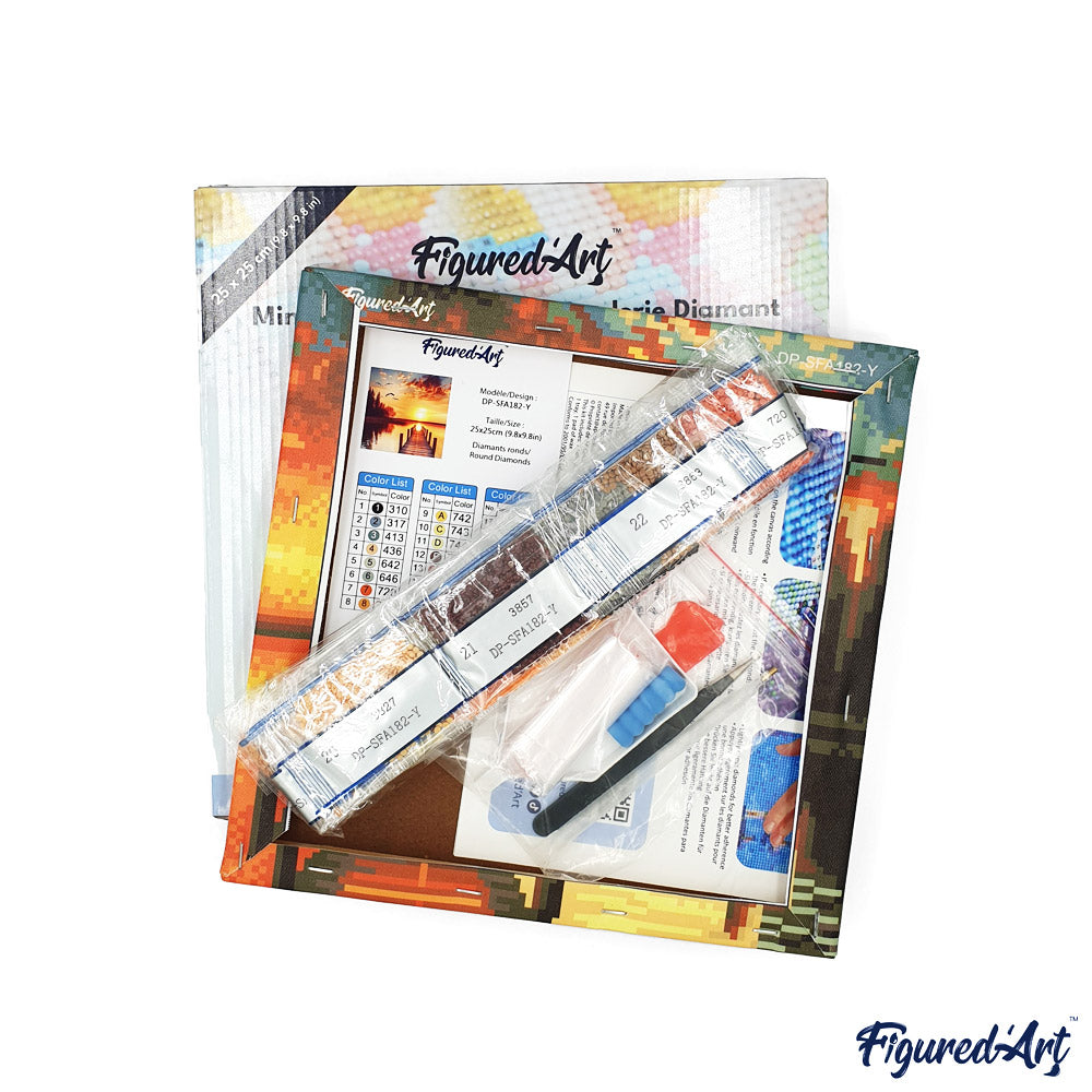 Deze prachtige mini Diamond Painting kit in een compact formaat van 25x25 cm met ronde diamanten is beschikbaar met of zonder houten frame en bevat alles wat u nodig heeft om uw kunstwerk te maken: