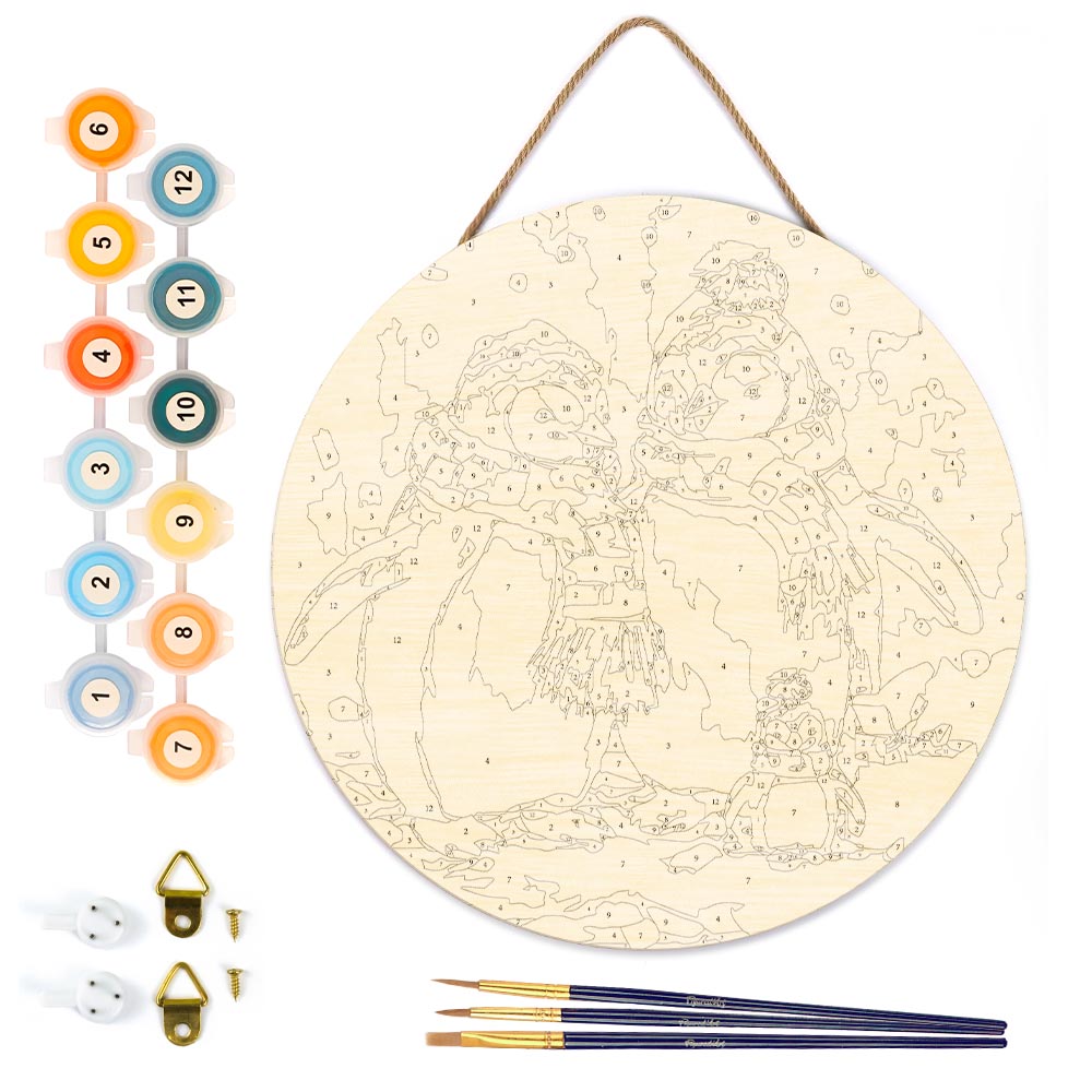 Schilderen op Nummer op Houten Schijf - Pinguïnfamilie in de Sneeuw