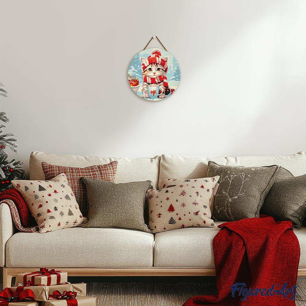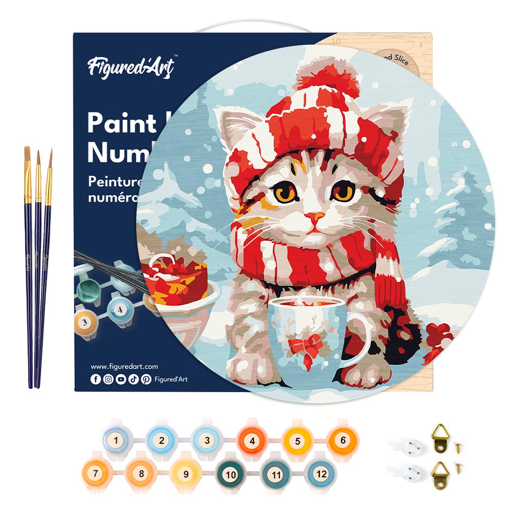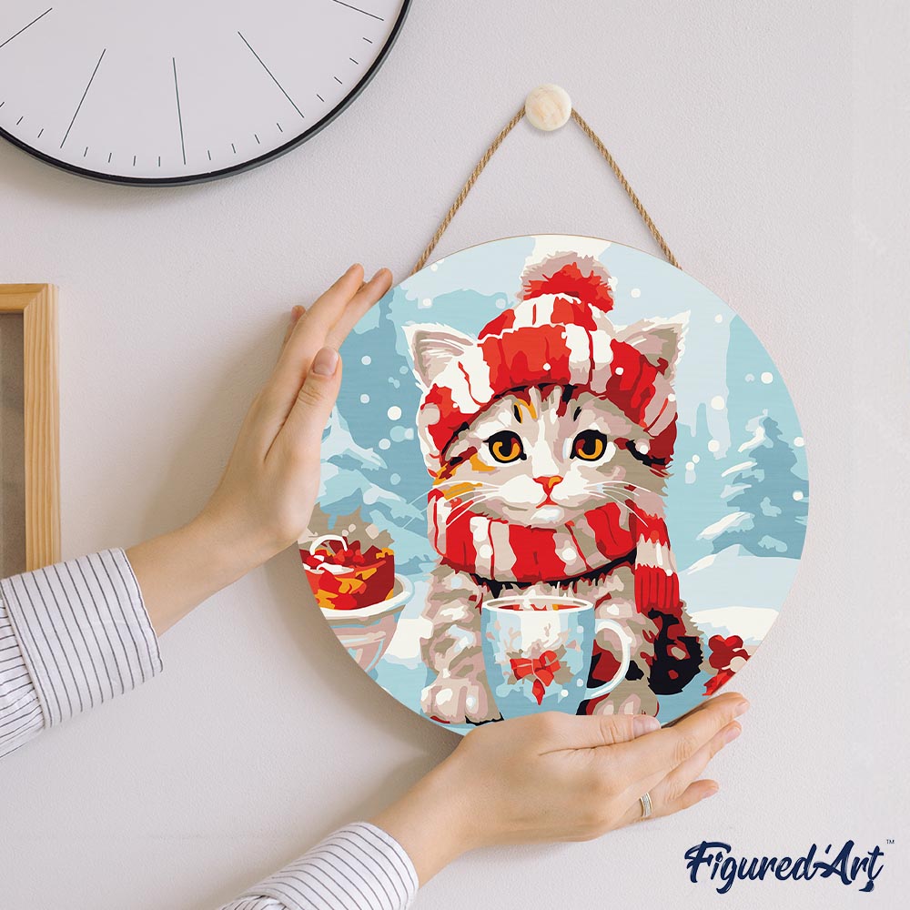 Schilderen op Nummer op Houten Schijf - Schattige Kat met Rode Sjaal