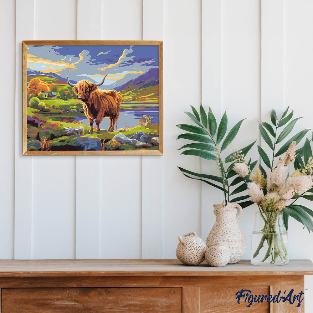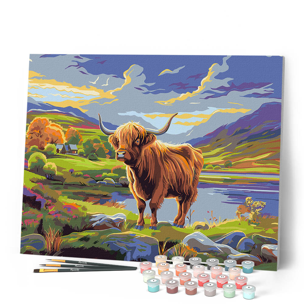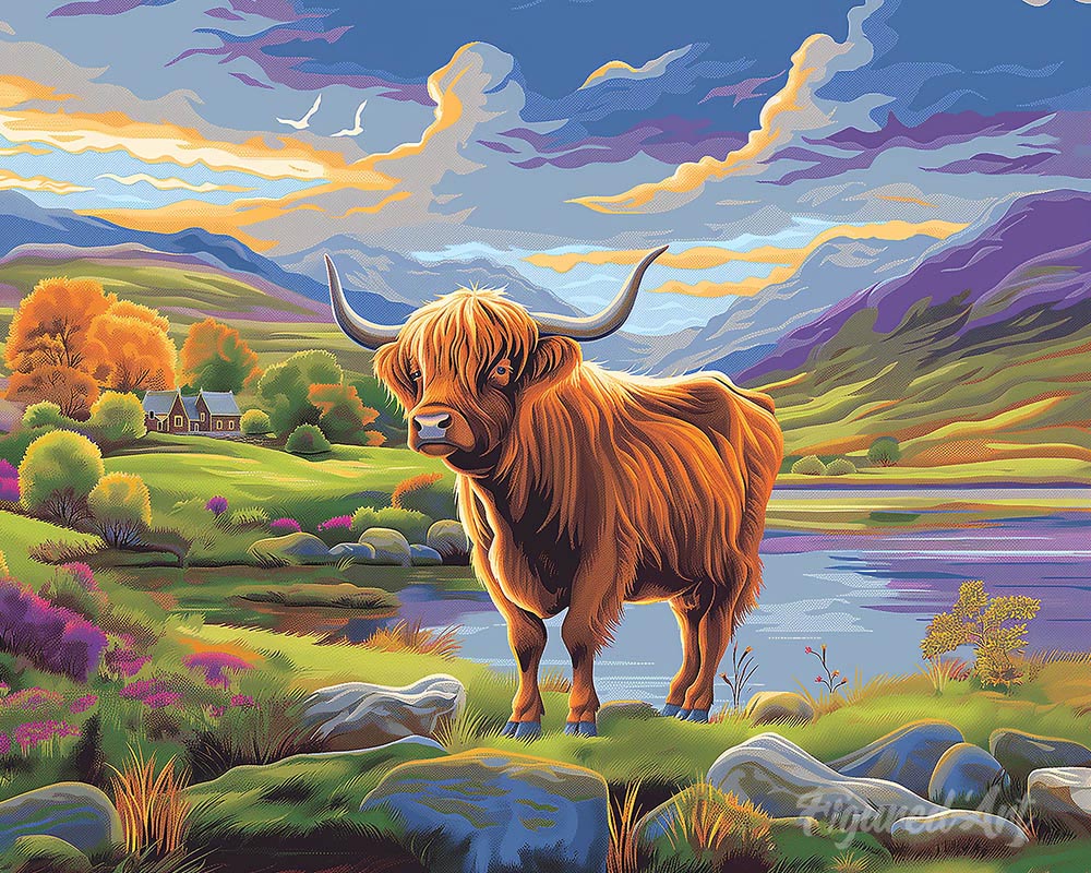 Model: Schotse Hooglander onder geschilderde hemel
