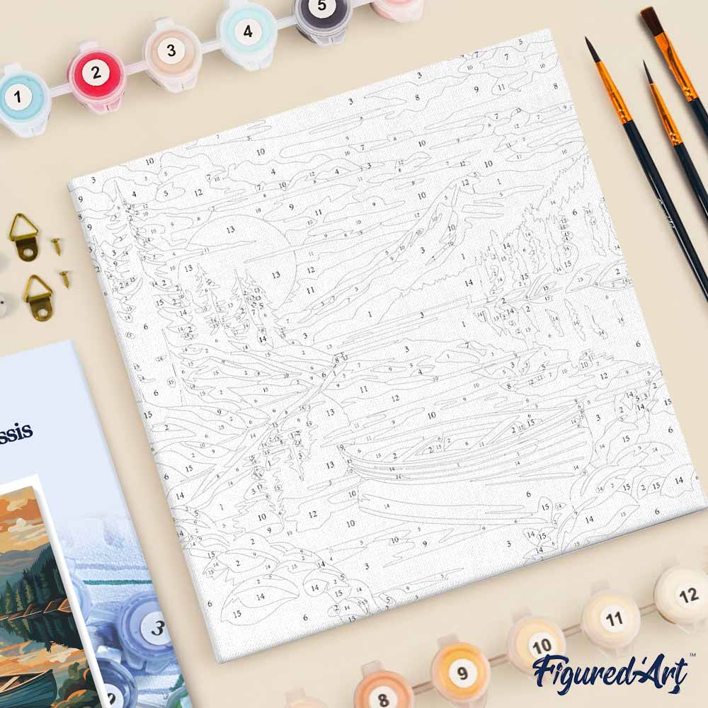 2) Je ontvangt een compleet pakket met genummerd canvas, genummerde potten verf, penselen en een foto van het verwachte resultaat om jou te gidsen. Laat de reis beginnen!