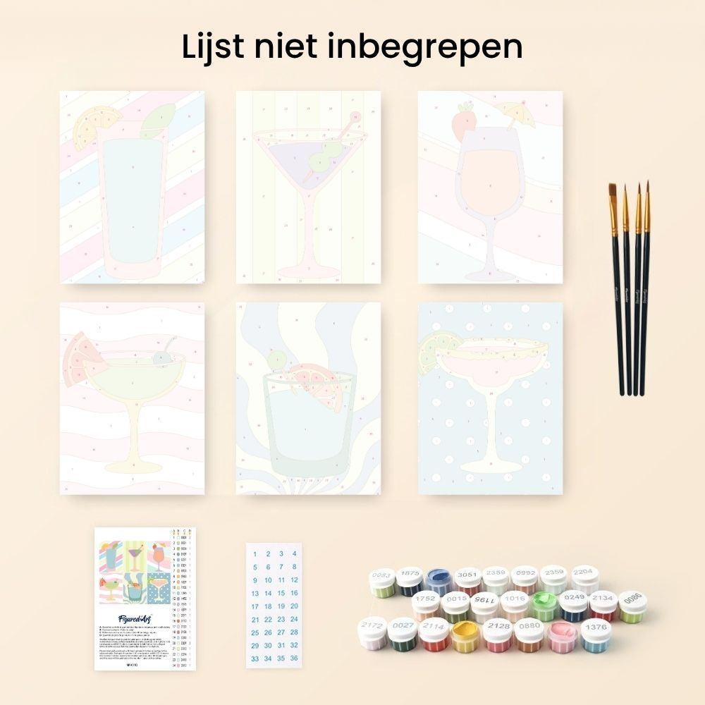 Met het Pop Art Cocktails set kun je genieten van zes kleurrijke schilderen op nummers cocktails ontwerpen. Van klassieke martini's en tropische drankjes tot elegante garneringen, deze creaties brengen een feestelijke en verfijnde sfeer. Perfect om gasten te vermaken of een vleugje elegantie toe te voegen aan elk interieur.