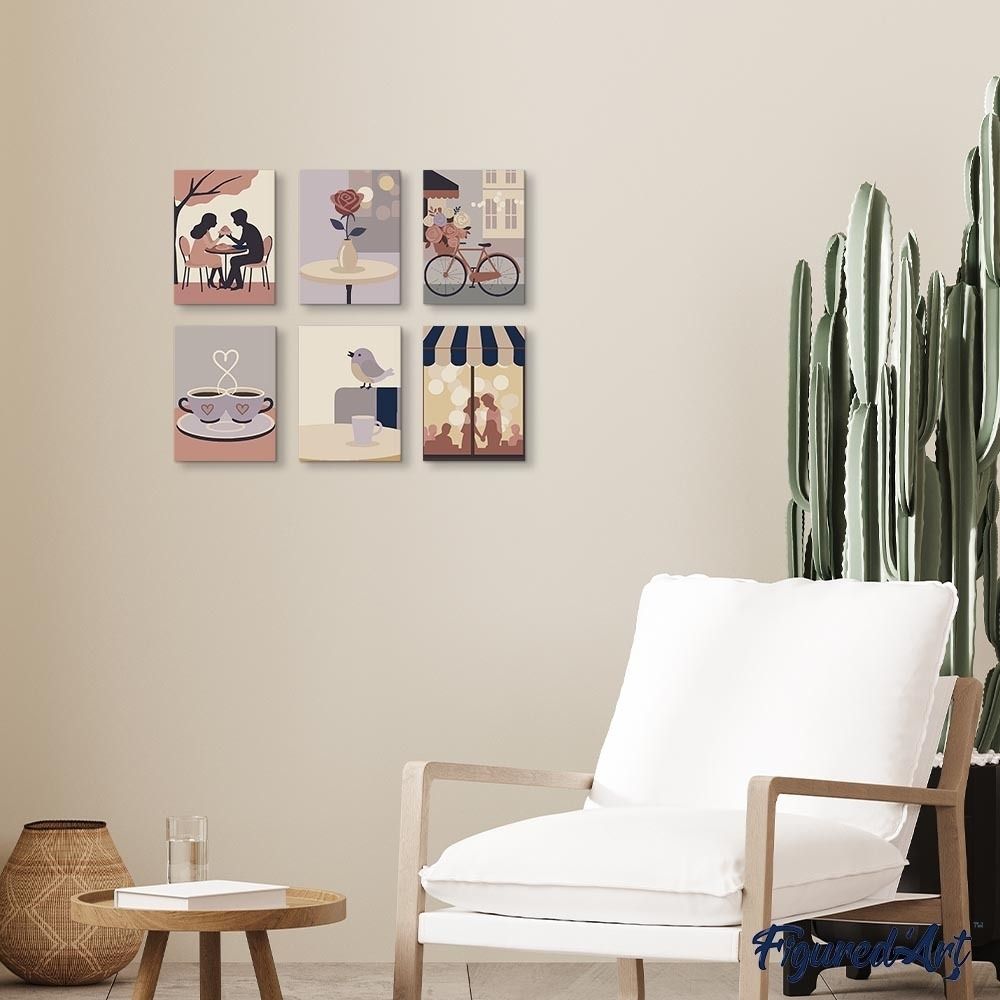 Het Romantisch Café set bevat zes ontwerpen van schilder op nummer die de essentie van een klassieke romantische afspraak in de stad vastleggen. Zachte taferelen van gedeelde koffies, fluisterende liefdeswoorden, rode rozen en ontspannen fietstochten komen samen in een dromerig kleurenpalet. Elk doek roept tederheid en verbondenheid op, waardoor alledaagse momenten veranderen in tijdloze uitingen van genegenheid.