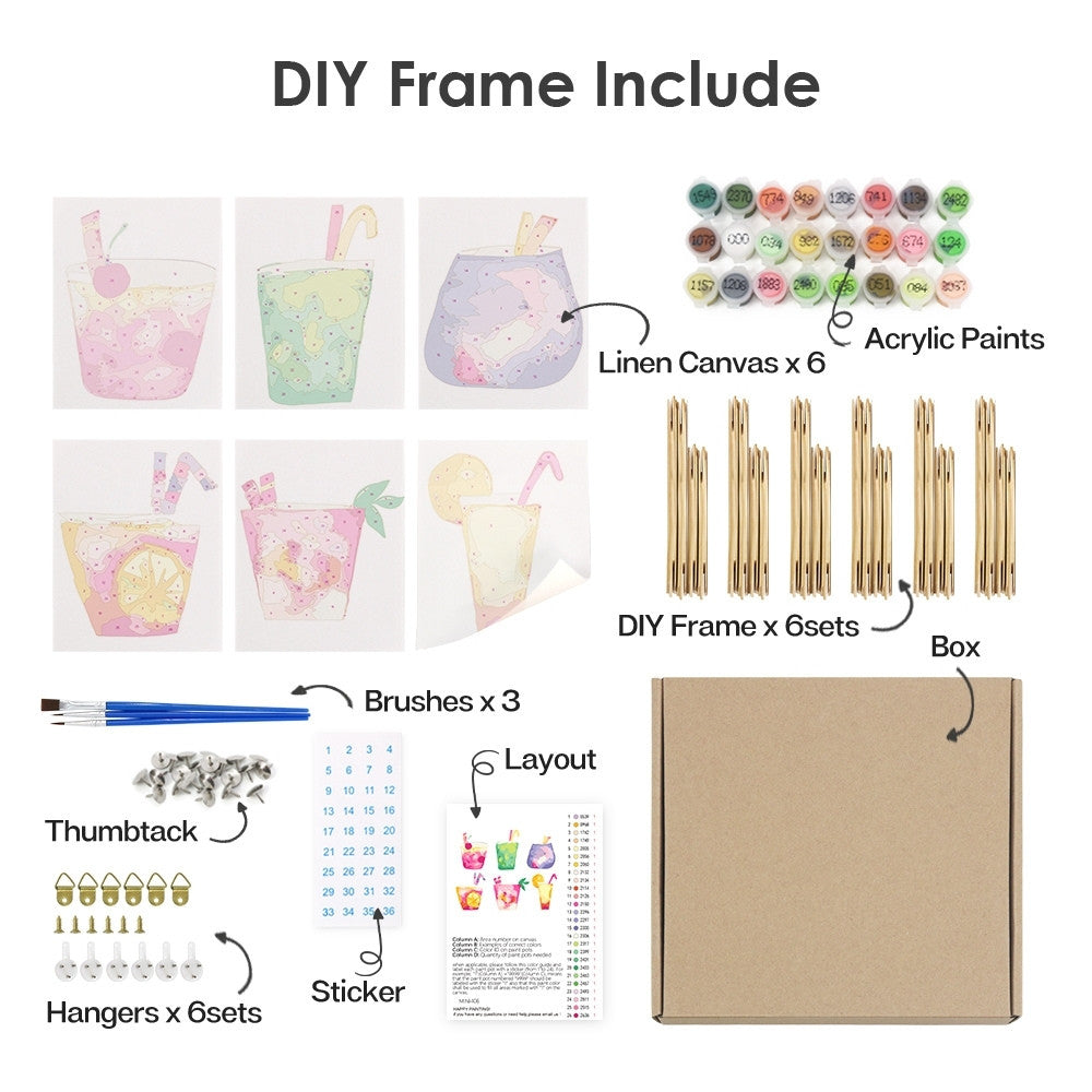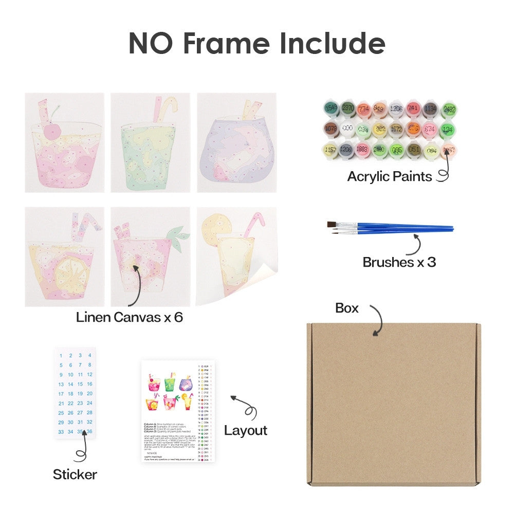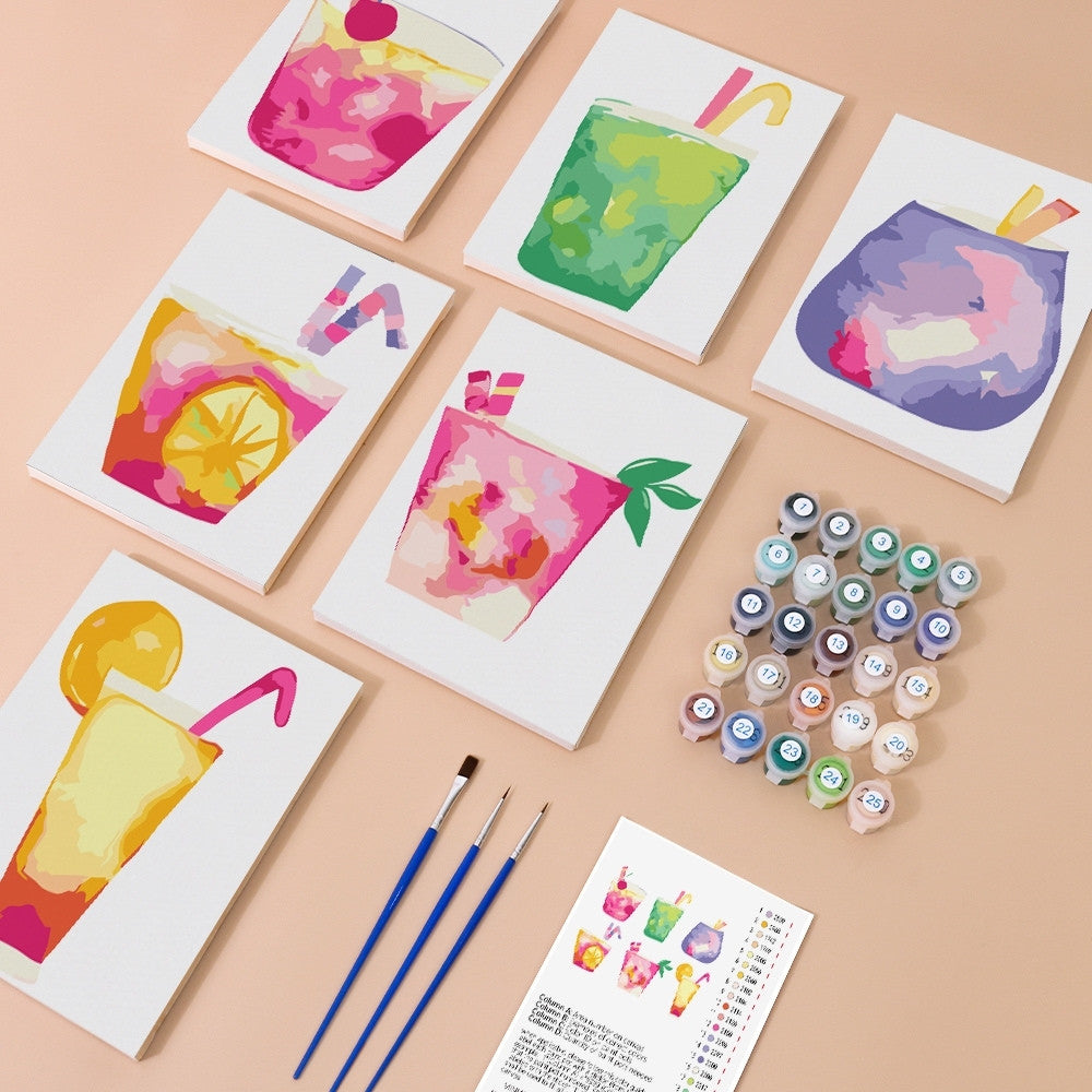 Ontdek het plezier van schilderen met onze Schilderen op nummer – Set van 6 doeken | Tropische Popdranken. Elke set bevat zes themadoeken, voor-gemengde acrylverf en alle benodigde tools. Volg de genummerde gids om te genieten van een ontspannende hobby en prachtige kunstwerken te creëren die je met trots kunt tonen of cadeau doen.