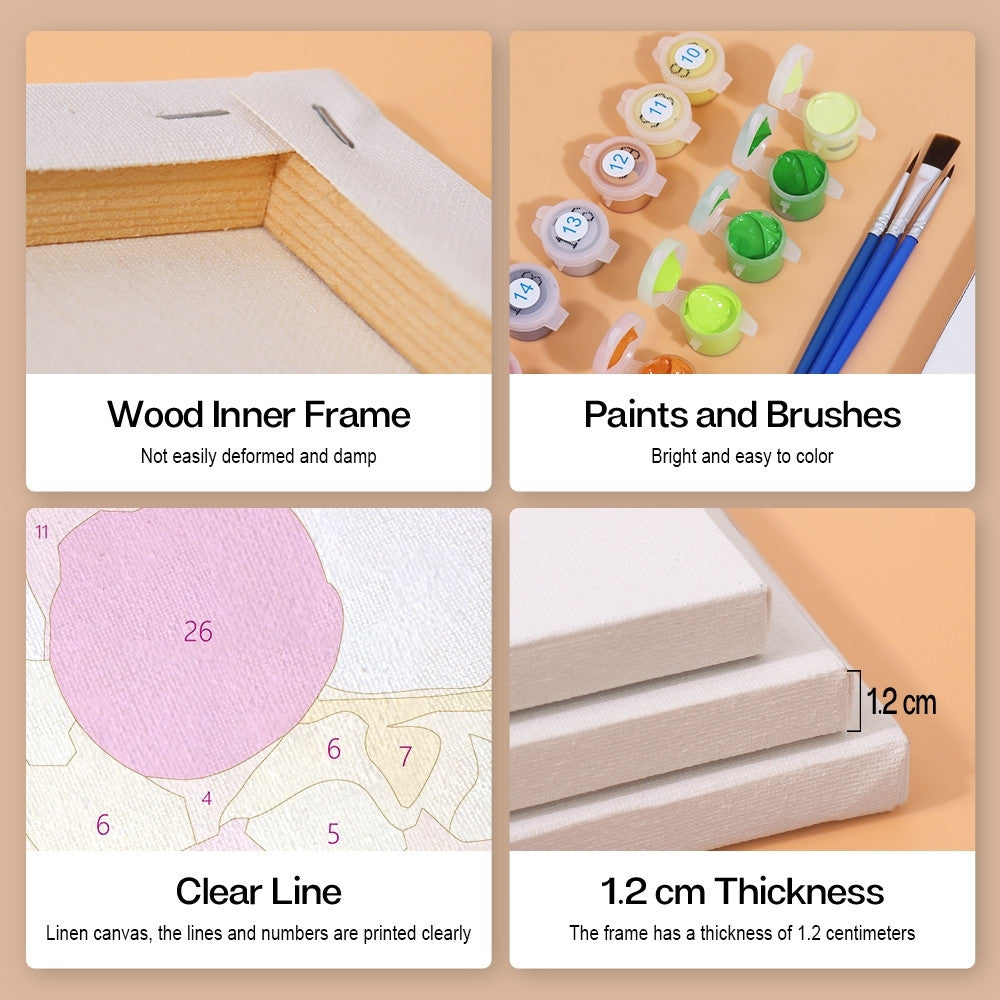 2) Je ontvangt een compleet pakket met genummerd canvas, genummerde potten verf, penselen en een foto van het verwachte resultaat om jou te gidsen. Laat de reis beginnen!