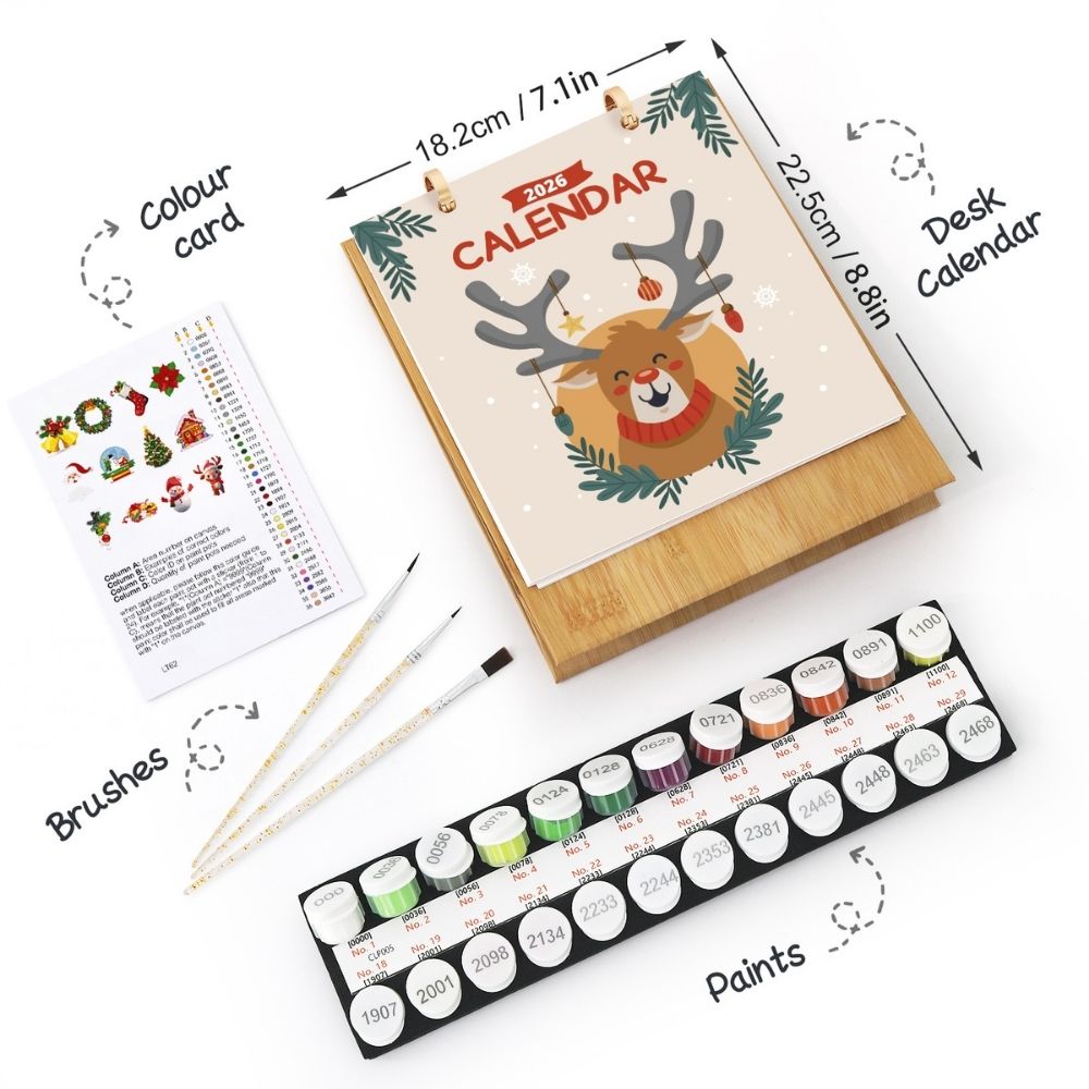 Breng een feestelijke sfeer in uw jaar met charmante illustraties geïnspireerd door de feestdagen. Elke maand onthult een nieuw ontwerp met geliefde kersticonen — van sneeuwvlokken en sokken tot rendieren en bellen — klaar om tot leven te worden gebracht met sprankelende acrylverf. Het is een creatieve kalender die de aftelling naar uw favoriete seizoen nog magischer maakt.