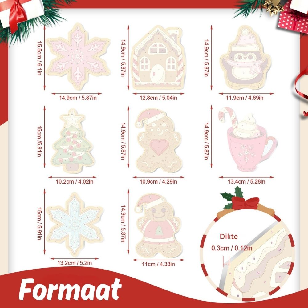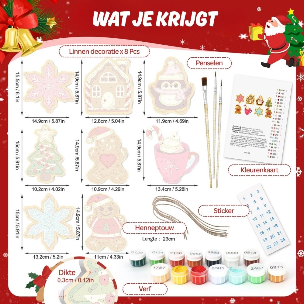 Omhul uw vakantie met warmte en creativiteit met de Kerstornamenten Schilderen op Nummers.Deze prachtige ornamenten brengen de magie van kerstkoekjes tot leven. Elk houten stuk is gevormd als feestelijke favorieten: peperkoekmannetjes, huizen, sterren en meer, klaar om geschilderd te worden met warme feestkleuren. Een leuke en creatieve manier om je boom te versieren terwijl je je persoonlijke touch toevoegt. Elk stuk vangt de vrolijke geest van geven en winterse gezelligheid en vormt een hartverwarmende aanvulling op uw vakantieversiering. Volg gewoon de nummers en zie hoe uw ornamenten tot leven komen met kleur en charme.