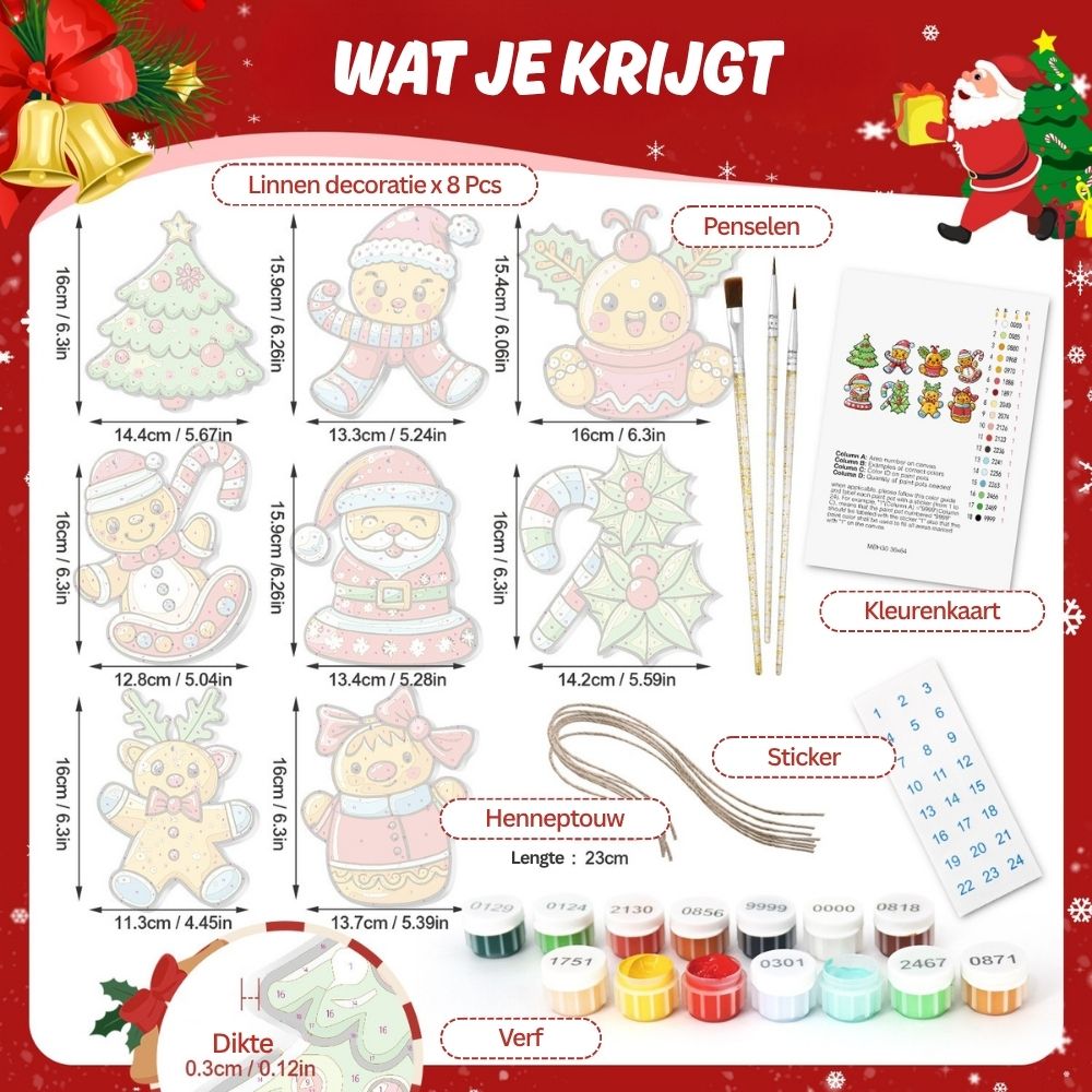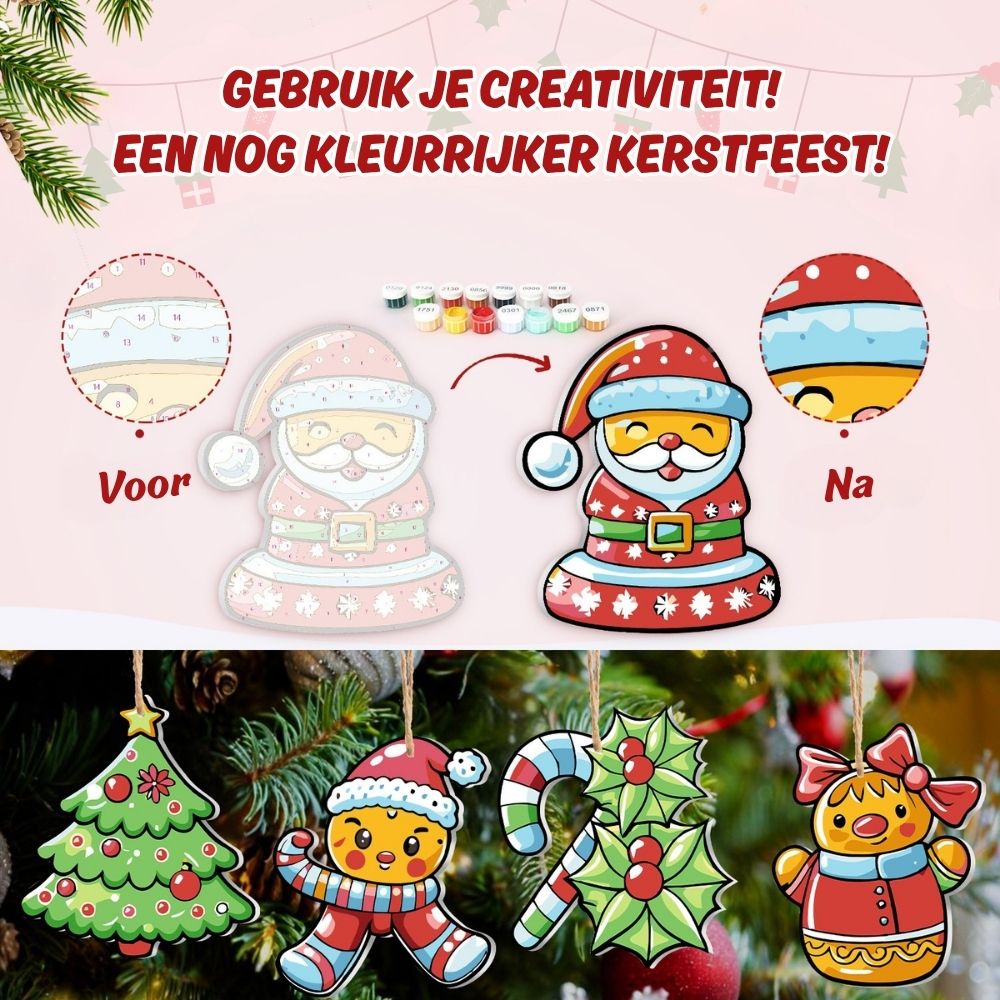 Omhul uw vakantie met warmte en creativiteit met de Kerstornamenten Schilderen op Nummers.Deze prachtige ornamenten brengen de magie van kerstkoekjes tot leven. Elk houten stuk is gevormd als feestelijke favorieten: peperkoekmannetjes, huizen, sterren en meer, klaar om geschilderd te worden met warme feestkleuren. Een leuke en creatieve manier om je boom te versieren terwijl je je persoonlijke touch toevoegt. Elk stuk vangt de vrolijke geest van geven en winterse gezelligheid en vormt een hartverwarmende aanvulling op uw vakantieversiering. Volg gewoon de nummers en zie hoe uw ornamenten tot leven komen met kleur en charme.