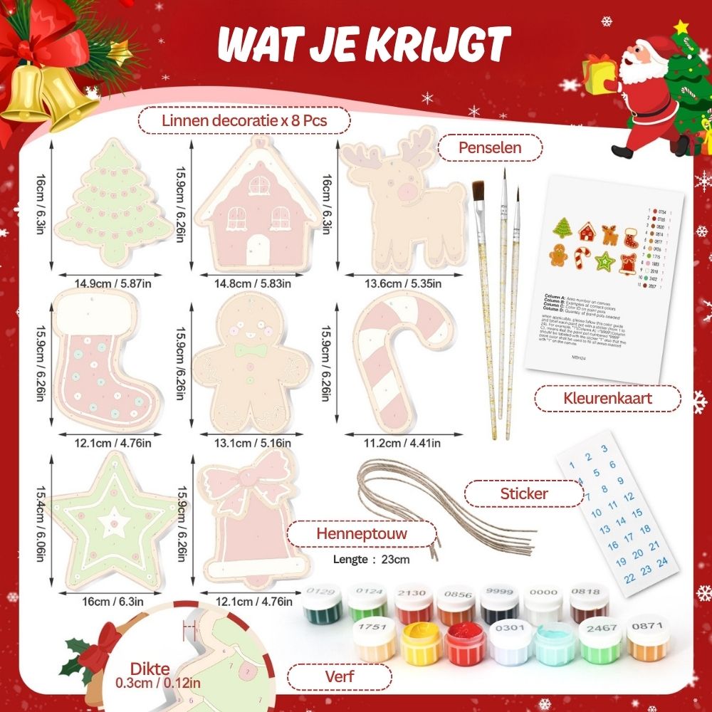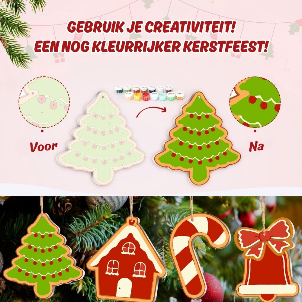 Omhul uw vakantie met warmte en creativiteit met de Kerstornamenten Schilderen op Nummers.Deze prachtige ornamenten brengen de magie van kerstkoekjes tot leven. Elk houten stuk is gevormd als feestelijke favorieten: peperkoekmannetjes, huizen, sterren en meer, klaar om geschilderd te worden met warme feestkleuren. Een leuke en creatieve manier om je boom te versieren terwijl je je persoonlijke touch toevoegt. Elk stuk vangt de vrolijke geest van geven en winterse gezelligheid en vormt een hartverwarmende aanvulling op uw vakantieversiering. Volg gewoon de nummers en zie hoe uw ornamenten tot leven komen met kleur en charme.