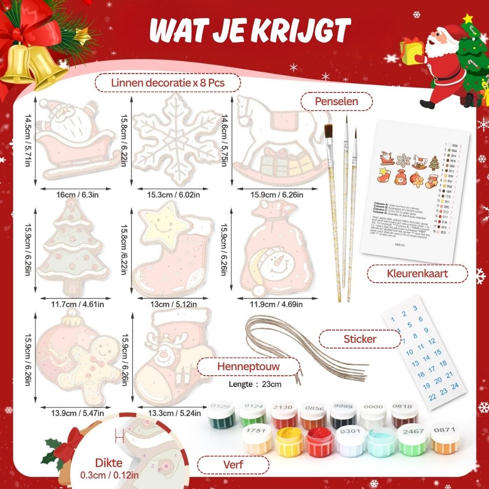 Omhul uw vakantie met warmte en creativiteit met de Kerstornamenten Schilderen op Nummers.Deze prachtige ornamenten brengen de magie van kerstkoekjes tot leven. Elk houten stuk is gevormd als feestelijke favorieten: peperkoekmannetjes, huizen, sterren en meer, klaar om geschilderd te worden met warme feestkleuren. Een leuke en creatieve manier om je boom te versieren terwijl je je persoonlijke touch toevoegt. Elk stuk vangt de vrolijke geest van geven en winterse gezelligheid en vormt een hartverwarmende aanvulling op uw vakantieversiering. Volg gewoon de nummers en zie hoe uw ornamenten tot leven komen met kleur en charme.