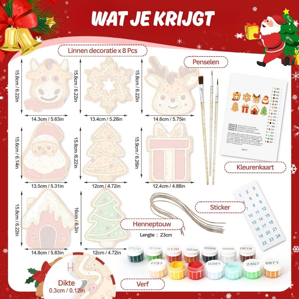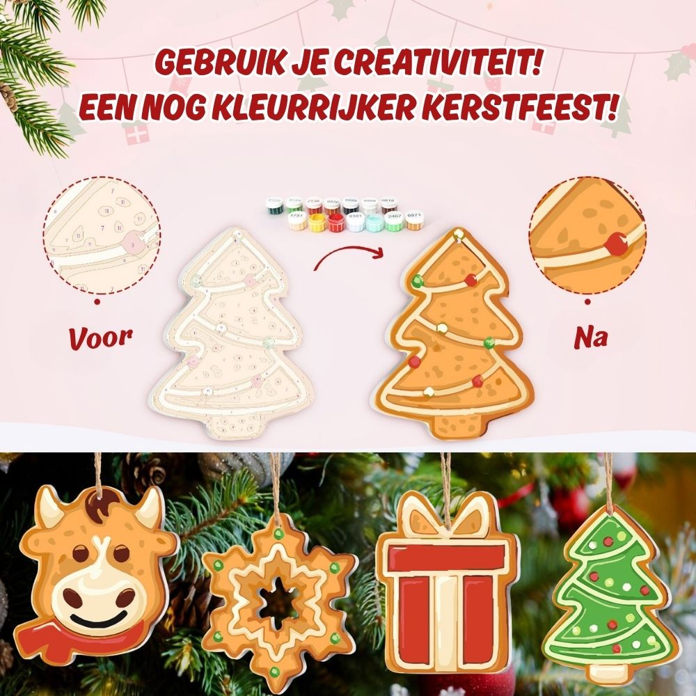 Omhul uw vakantie met warmte en creativiteit met de Kerstornamenten Schilderen op Nummers.Deze prachtige ornamenten brengen de magie van kerstkoekjes tot leven. Elk houten stuk is gevormd als feestelijke favorieten: peperkoekmannetjes, huizen, sterren en meer, klaar om geschilderd te worden met warme feestkleuren. Een leuke en creatieve manier om je boom te versieren terwijl je je persoonlijke touch toevoegt. Elk stuk vangt de vrolijke geest van geven en winterse gezelligheid en vormt een hartverwarmende aanvulling op uw vakantieversiering. Volg gewoon de nummers en zie hoe uw ornamenten tot leven komen met kleur en charme.