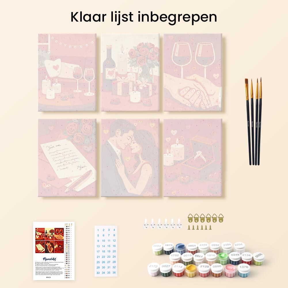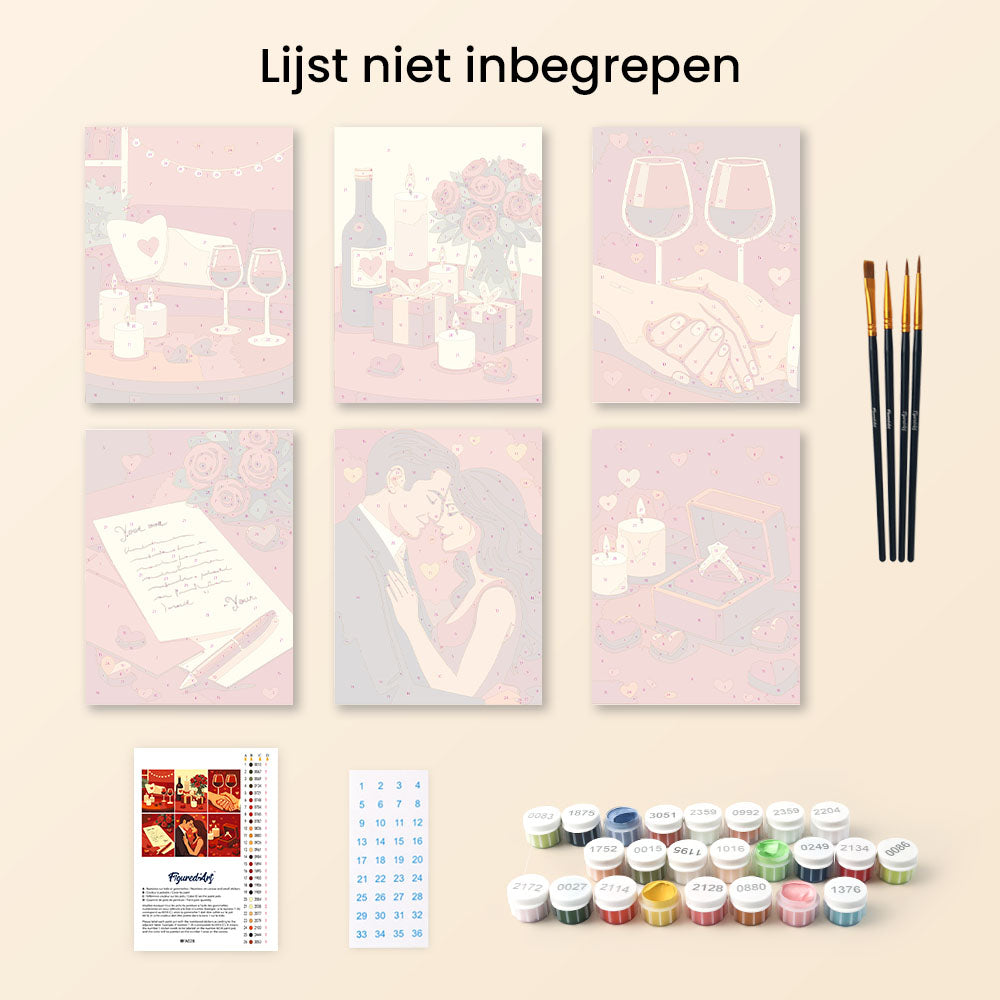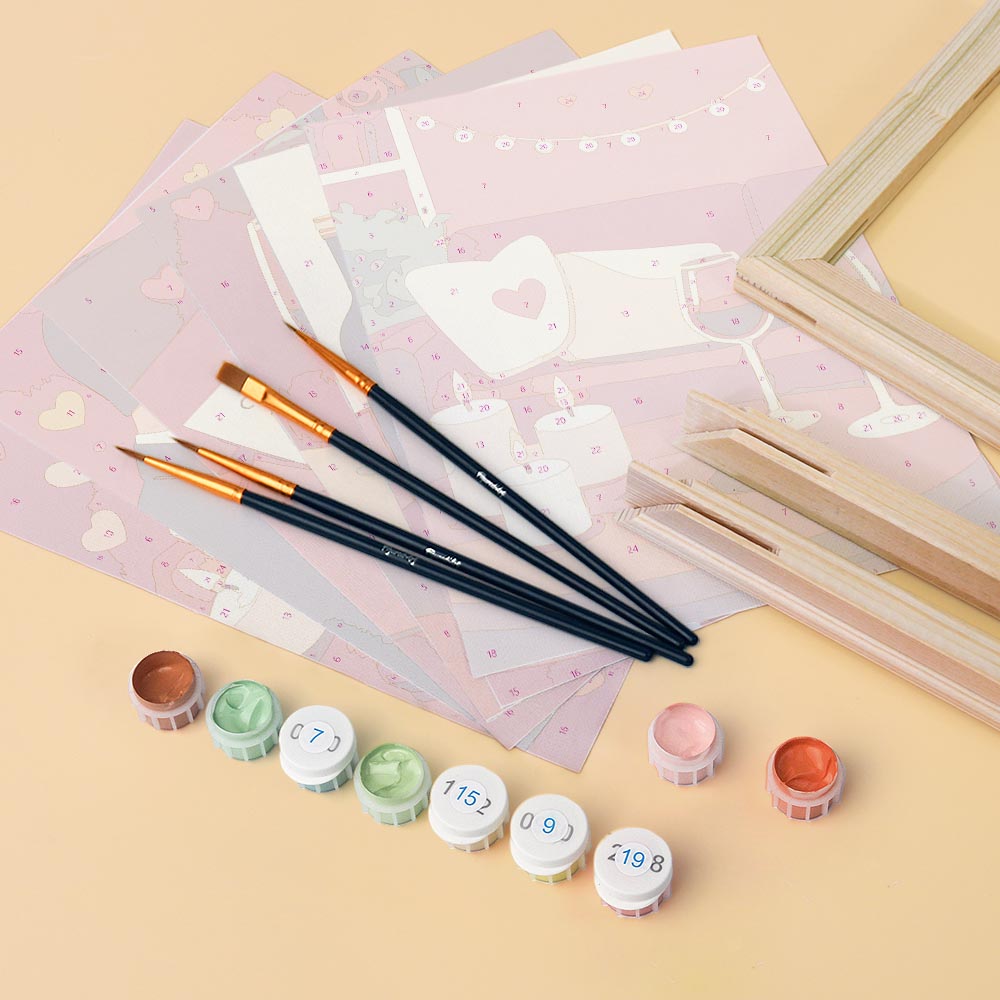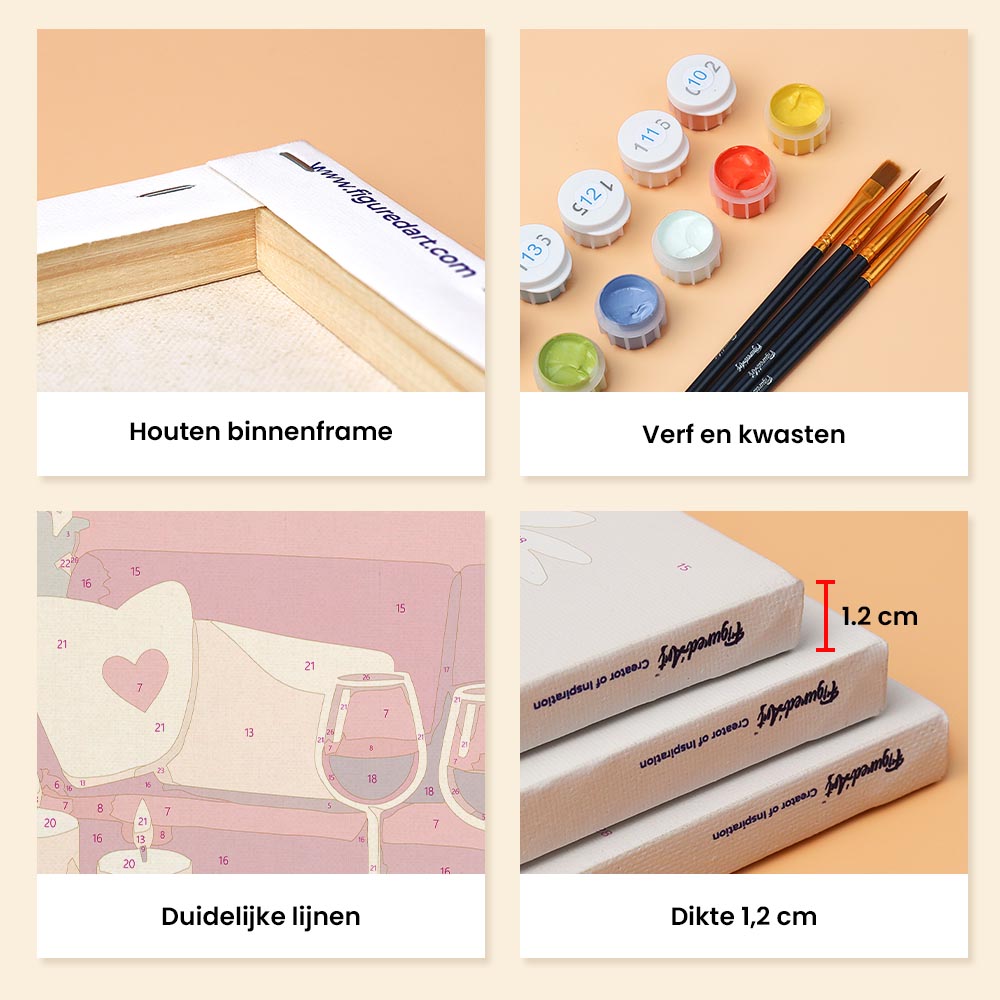 2) Je ontvangt een compleet pakket met genummerd canvas, genummerde potten verf, penselen en een foto van het verwachte resultaat om jou te gidsen. Laat de reis beginnen!