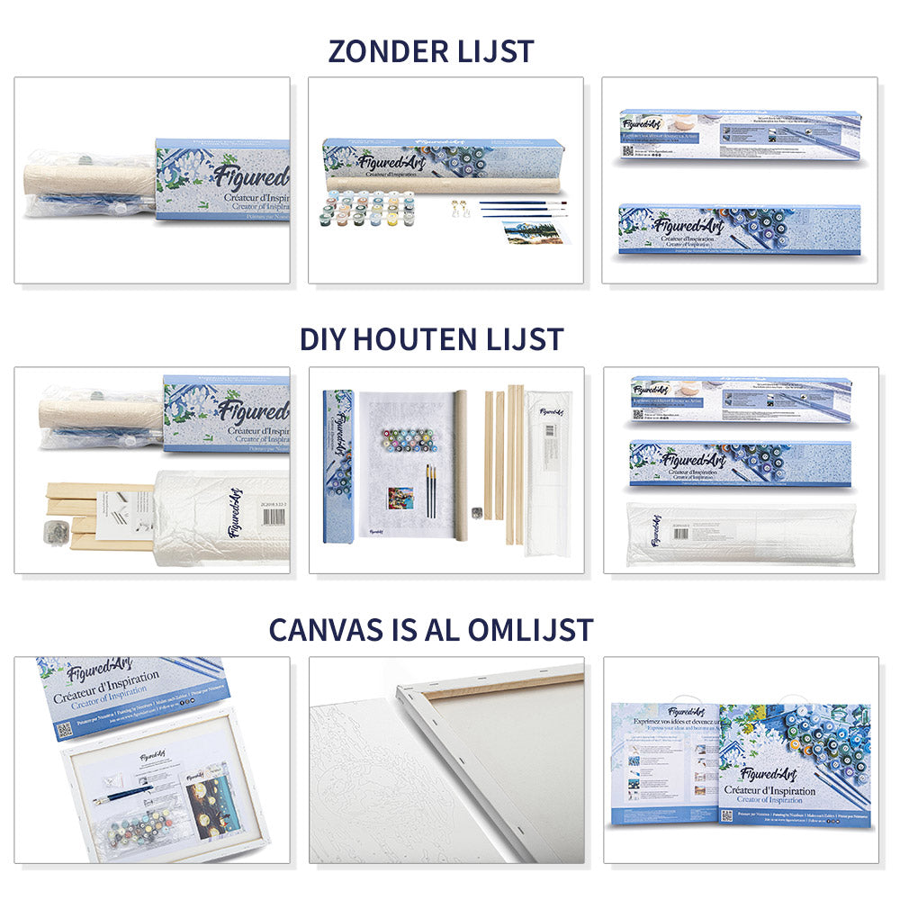 Complete set van schilderen op nummers met opgerold canvas zonder plooien en een houten lijst om zelf in elkaar te zetten.