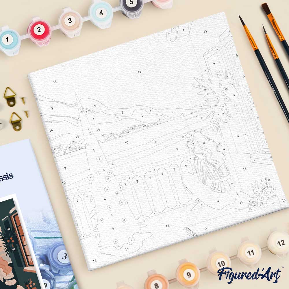 2) Je ontvangt een compleet pakket met genummerd canvas, genummerde potten verf, penselen en een foto van het verwachte resultaat om jou te gidsen. Laat de reis beginnen!