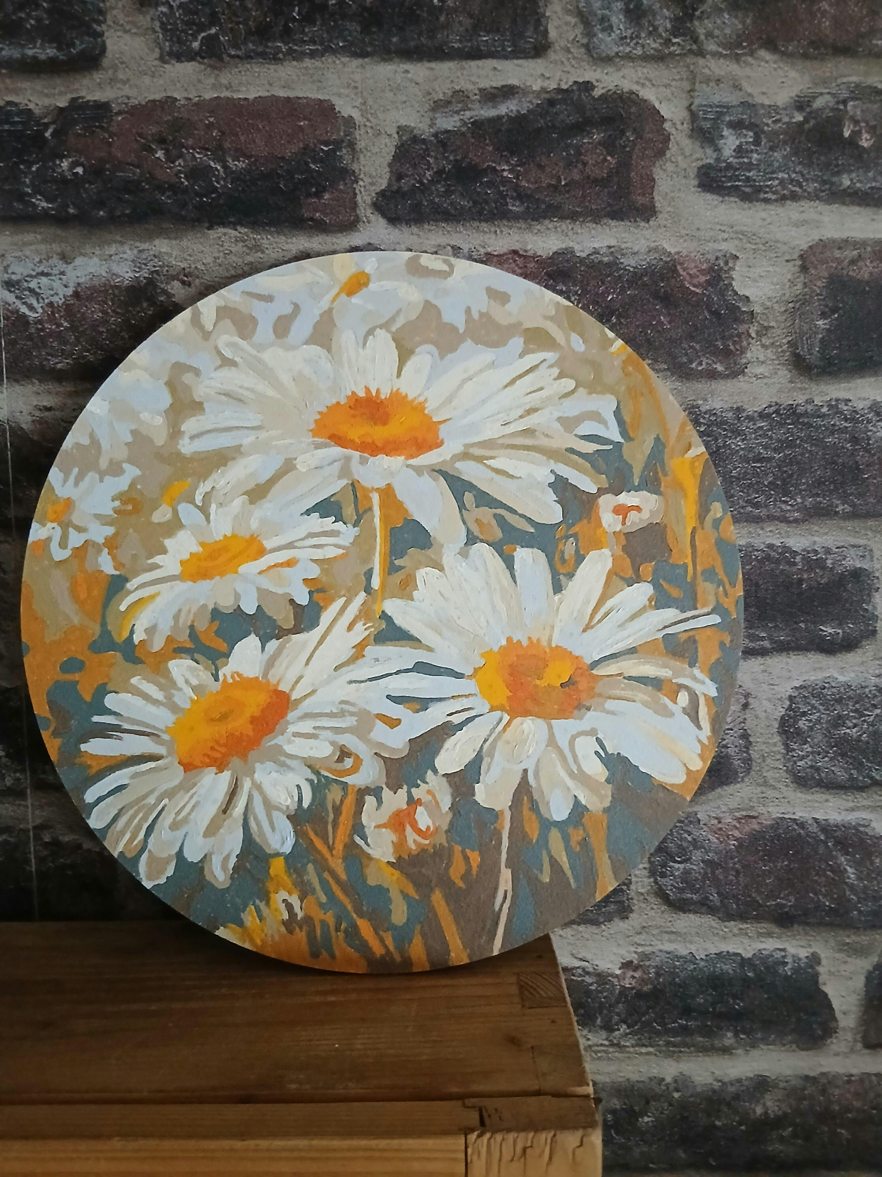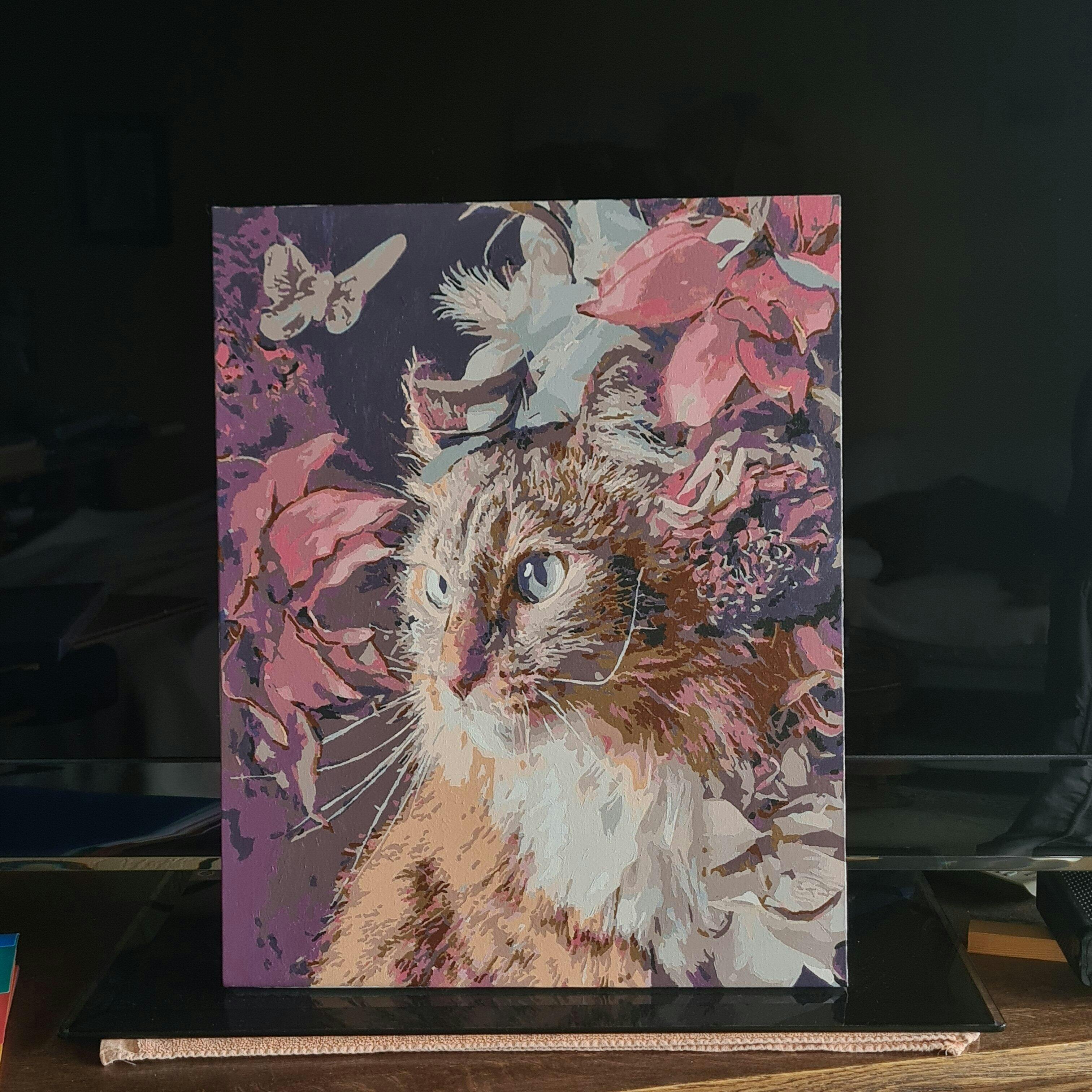Dit is mijn 8e schilderen op nummer. Heerlijke rustgevende hobby. Begonnen met de bloemen, daarna de vaas, gordijnen en tot slot het raam. Ruim een week over gedaan. Ik zou de moeilijkheidsgraad als gemiddeld willen beoordelen ipv eenvoudig. Vooral door de bloemen. Ook gebruik ik eigen kwasten, de meegeleverde kwasten vind ik minder fijn vasthouden door dd dunne stelen. Maar ik heb weer genoten. Tot nu toe landschappen, strand, zee en poes geschilderd. Dit was een leuke afwisseling.