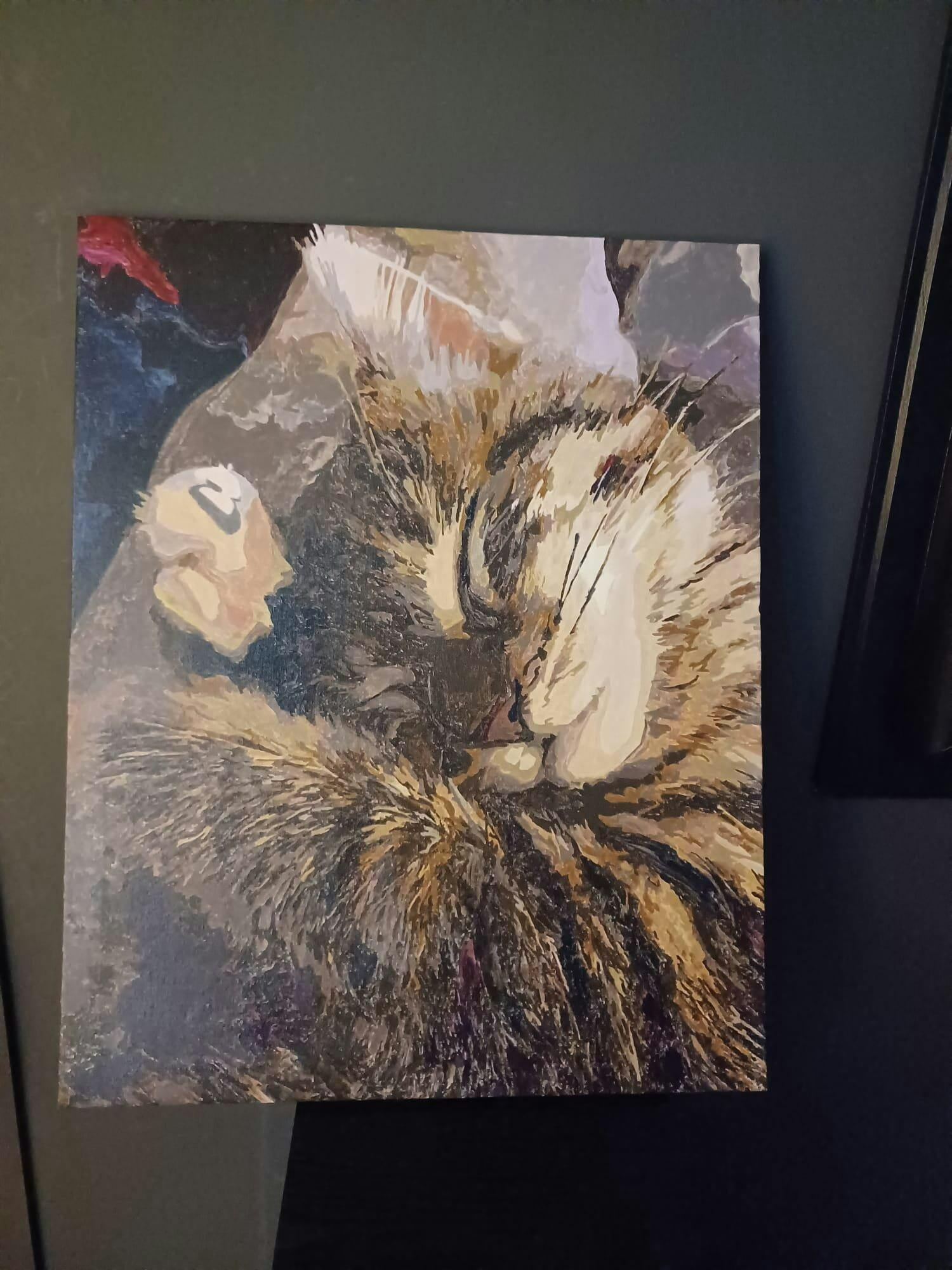 Wat een prachtig resultaat. De kat is bijna echt, heel leuk om te doen. Heel fijntjes en ik heb wel weer problemen gehad met een verfpotje halfdroog, dus water moeten gebruiken om deze volledig te kunnen gebruiken. En 1 verfpot leeg terwijl ik er nog nodig had... dit is te herzien om een 2e potje te geven met het schilderij !